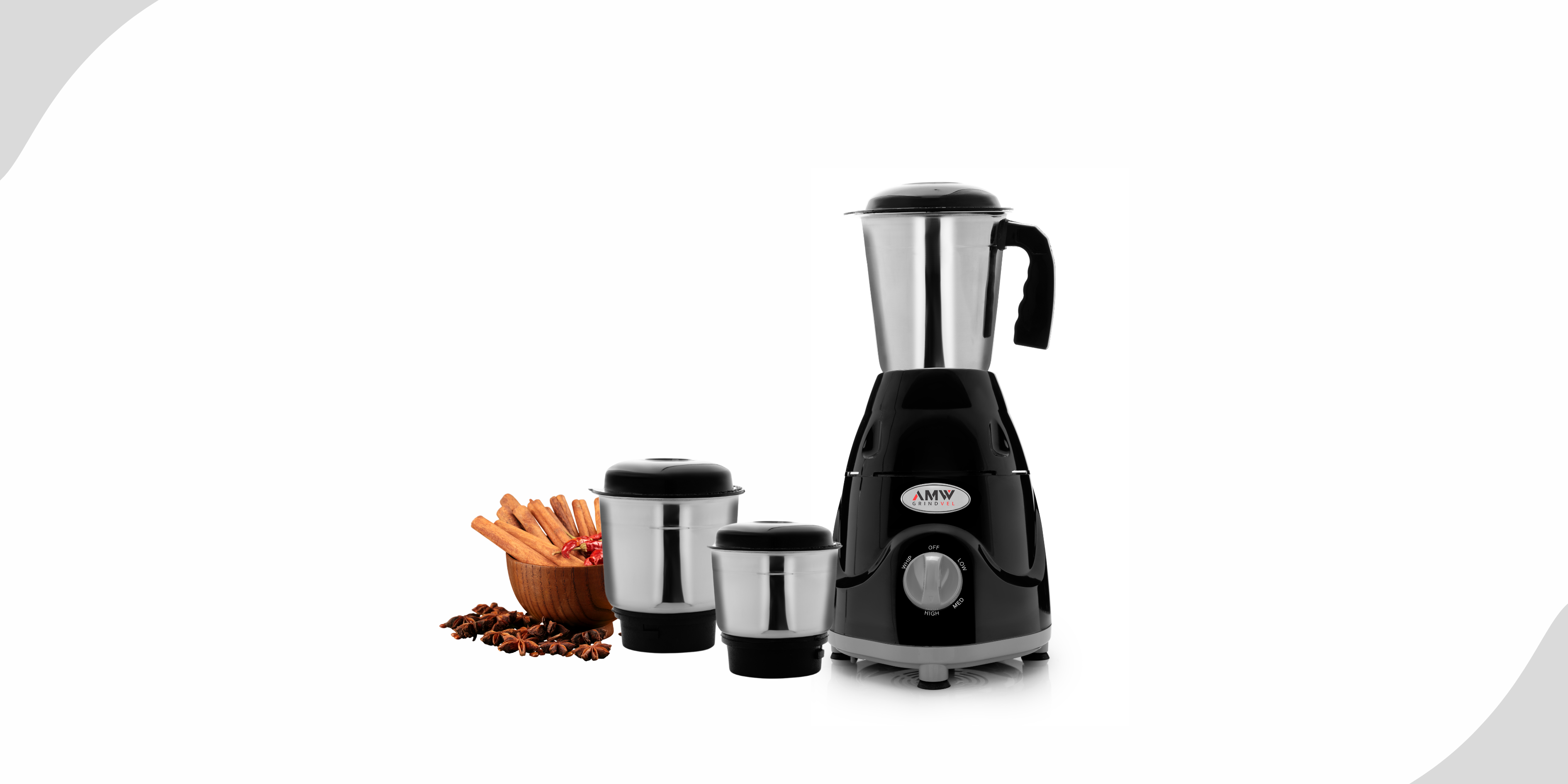 AMW GRINDVEL 750-Watt Mixer Grinder with 3 Stainless Steel Jars | 3 Speed Control | Overload Protection | Shock-Proof ABS Body | Nylon Coupling | Powerful Motor (Black & Grey)