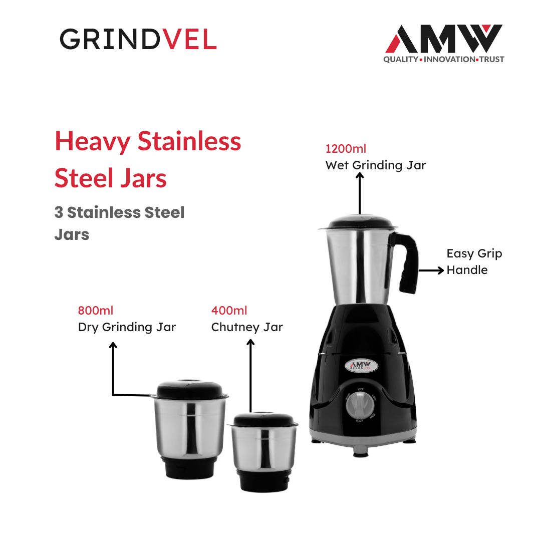 Upgrade your kitchen power with the AMW GRINDVEL Mixer Grinder – 750W Edition, designed for maximum efficiency and superior grinding performance. Now available in a bold and elegant Black & Grey color combination, this mixer grinder blends durability with modern style.