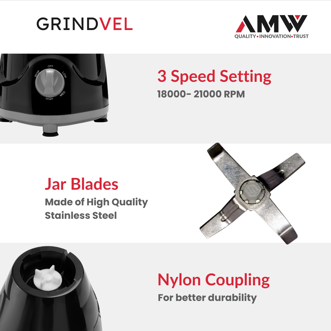 AMW GRINDVEL 750-Watt Mixer Grinder with 3 Stainless Steel Jars | 3 Speed Control | Overload Protection | Shock-Proof ABS Body | Nylon Coupling | Powerful Motor (Black & Grey)
